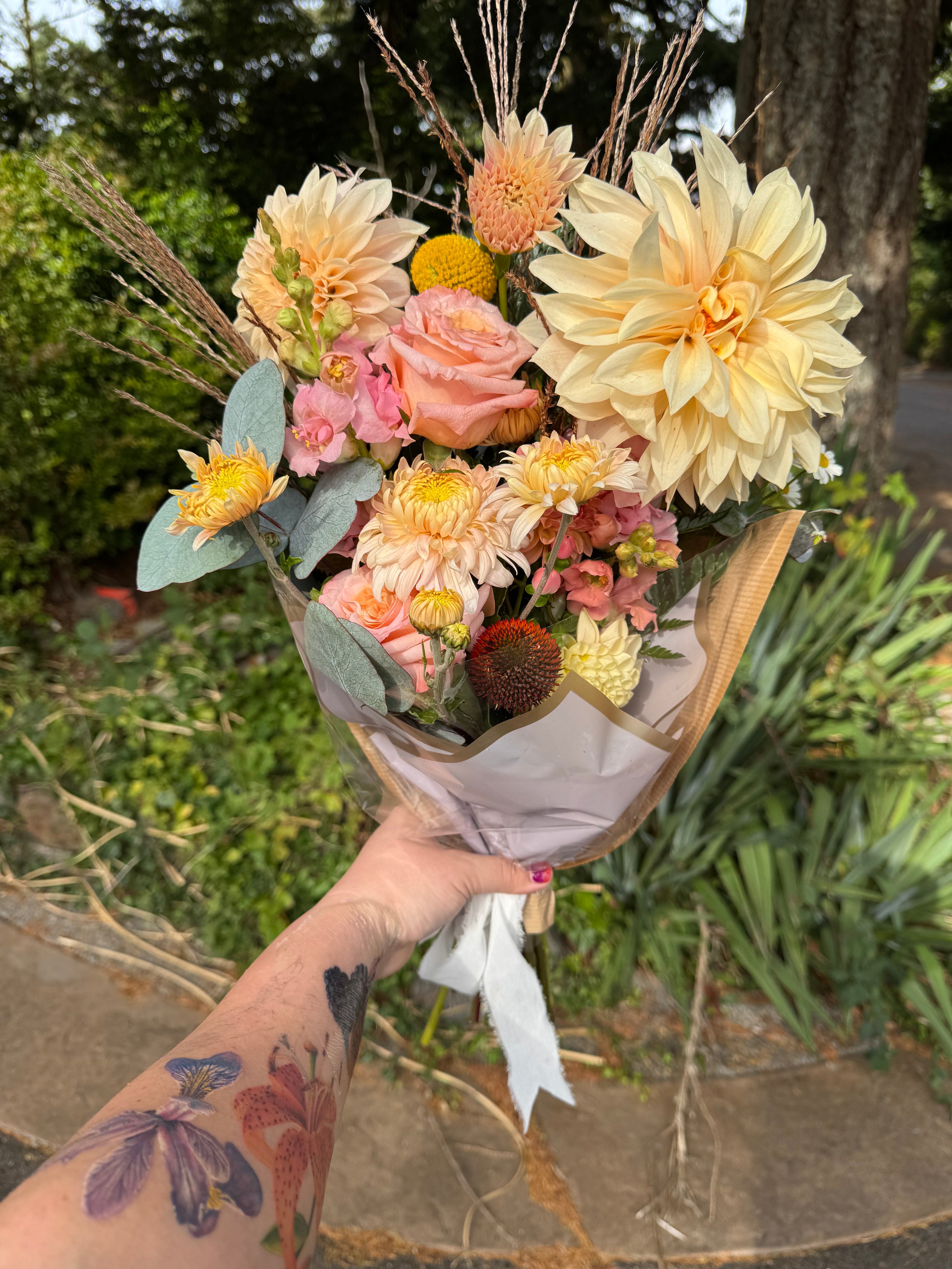 Beautiful fresh flowers and greens uniquely arranged into a hand-tied bouquet and wrapped in floral paper.