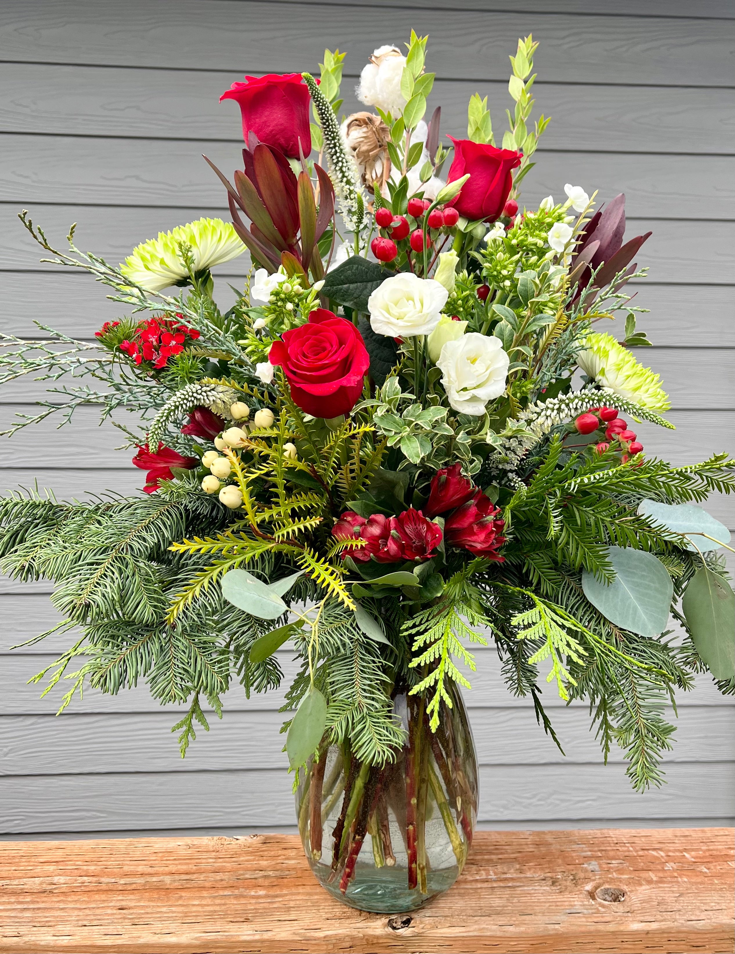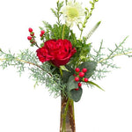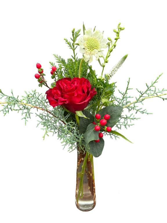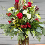 Celebrate the season with our Holiday Bouquets, featuring fresh flowers and fragrant greens, thoughtfully arranged in a glass vase. Each bouquet is a one-of-a-kind creation, emphasizing red and/or white blossoms to capture the holiday spirit.